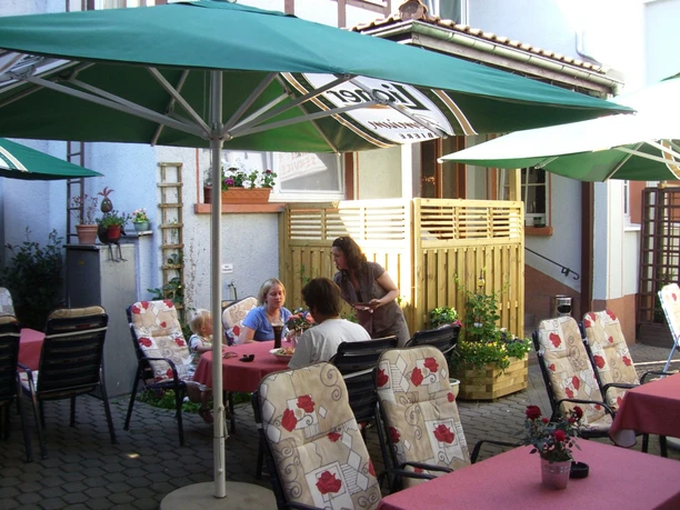Inmitten der Fachwerk-Hofreite lädt in den Sommermonaten ein gemütlicher Biergarten mit ca. 40 Sitzplätzen zum Verweilen ein.